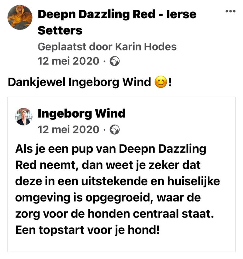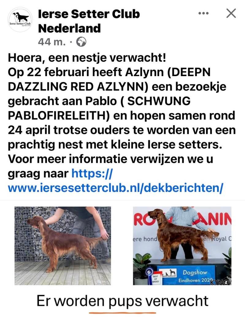 Indien u in aanmerking wenst te komen voor een pup kunt u een mail sturen via het contactformulier met daarin alle adresgegevens, wat persoonlijke informatie (zoals samenstelling gezin, woon-/werksituatie, reden om te kiezen voor een Ierse Setter, etc.) en of er een voorkeur is voor een reutje of teefje. Omdat de bevalling al in aantocht is, is het nu niet meer mogelijk om van te voren te komen kennismaken, maar u kunt uiteraard wel telefonisch contact opnemen (Harald: +31 (0)6 5050 3185).
